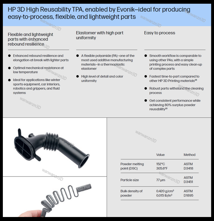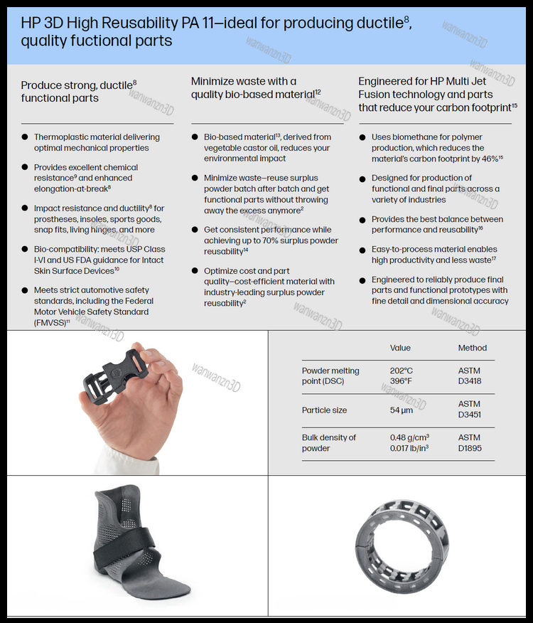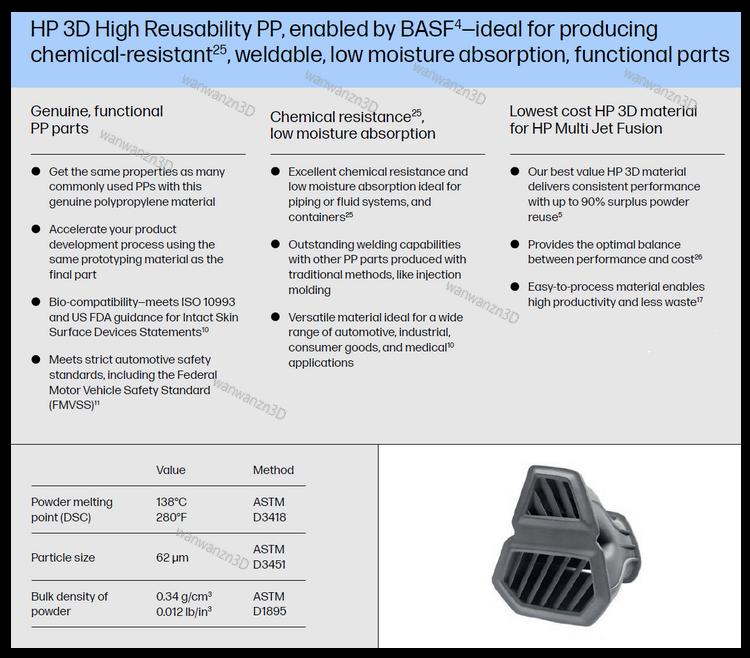 3d打印定制服务:工业级MJF进口材材料有:PA12、PA12GB、PA11、TPU88A.其中PA12尼龙强度韧性耐温耐腐蚀性能好,很全面的一种热塑性工程塑料,既可以做前期原型验证,又可以作为最终产品交付。汽车配件及用品的结构和功能验证:如汽车挡板、后视镜、仪表盘、方向盘、车灯、座椅及把手等的结构和功能认证。PA12GB40%玻璃珠可使热塑性材料获得最佳的机械性能和高复用率。实现尺寸稳定性和可重复性。非常适合需要高刚度的应用,如外壳和机箱、固定装置和工具。PA 11具有更好的柔韧性和优异的耐冲击性,适用于生产假肢、鞋垫、运动用品、卡扣、活动铰链等。有更好的高温和低温性能,刚度更好。TPU88A打印的零件已经过广泛测试,包括皮肤接触 ISO 10993-10 和 ISO 10993-5测试、耐水解性测试、紫外稳定性测试,挥发性化合物测试、耐疲劳测试等,可直接与人体进行接触,满足汽车、消费品、医疗等行业的严苛要求。有更好的高温和低温性能。(WANWANZN3D®)