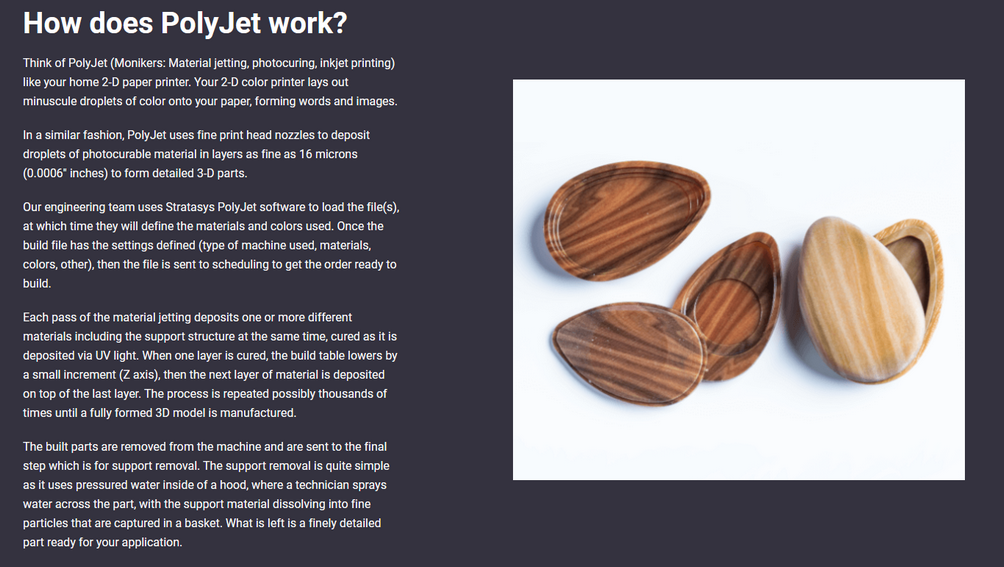 PolyJet技术以其出色的逼真度和惊人的美感而闻名。该技术的工作原理与传统的喷墨打印类似,但是打印头不是将墨水喷射到纸张上,而是将液态光敏聚合物喷射到构建托盘上,在该托盘中,每滴墨滴都会在紫外线中固化。